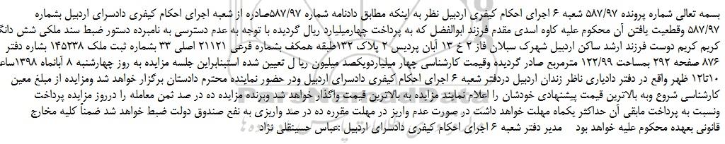 بسمه تعالی شماره پرونده 587/97 شعبه 6 اجرای احکام کیفری اردبیل نظر به اینکه مطابق دادنامه شماره 587/97صادره از شعبه اجرای احکام کیفری دادسرای اردبیل بشماره 587/97 وقطعیت یافتن آن محکوم علیه کاوه اسدی مقدم فرزند ابوالفضل که به پرداخت چهارمیلیارد ریال گردیده با توجه به عدم دسترسی به نامبرده دستور ضبط سند ملکی شش دانگ بنام کریم کریم دوست فرزند ارشد ساکن اردبیل شهرک سبلان فاز 2 خ 13 آبان پردیس 2 پلاک 132طبقه همکف بشماره فرعی 21121 اصلی 33 بشماره ثبت ملک 145238 بشاره دفتر 876 صفحه 292 بمساحت 122/99 مترمربع صادر گردیده وقیمت کارشناسی چهار میلیاردویکصد میلیون ریا ل تعیین شده استبنابراین جلسه مزایده به روز چهارشنبه 8 آبانماه 1398ساعت 10تا12 ظهر واقع در دفتر دادیاری ناظر زندان اردبیل دردفتر شعبه 6 اجرای احکام کیفری دادسرای اردبیل ودر حضور نماینده محترم دادستان برگزار خواهد شد ومزایده از مبلغ معین کارشناسی شروع وبه بالاترین قیمت پیشنهادی خودشان را اعلام نمایند مزایده به بالاترین قیمت واگذار خواهد شد وبرنده مزایده ده در صد ثمن معامله را درروز مزایده پرداخت ونسبت به پرداخت مابقی آن حداکثر یکماه مهلت خواهد داشت در صورت عدم واریز در مهلت مقرره ده در صد واریزی به نفع صندوق دولت ضبط خواهد شد ضمناً کلیه مخارج قانونی بعهده محکوم علیه خواهد بود    مدیر دفتر شعبه 6 اجرای احکام کیفری دادسرای اردبیل :عباس حسینقلی نژاد