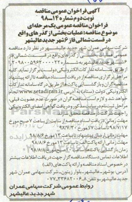 شرکت سهامی عمران شهر جدید عالیشهر در نظر دارد مناقصه عمومی  بخشی از گذرهای واقع در قسمت شمالی فاز 6 شهر جدید عالیشهر به شماره 2098005962000022 را از طریق سامانه تدارکات الکترونیکی دولت برگزار نماید.