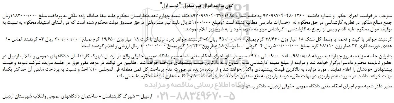 بموجب درخواست اجرای حکم و شماره دادنامه 9709970404801260 ودادنامه شماره 9709970403701485دادگاه شعبه چهارم تجدیدنظراستان محکوم علیه صفا عباداله زاده ملکی به پرداخت مبلغ 1182000/000ریال جمع مبالغ مذکور در نظریه کارشناسی در حق محکوم له (خسارات دادرسی مطالبه نشده است ).ومبلغ 59100/000ریال بابت نیم عشردولتی درحق صندوق دولت محکوم شده است که در راستای استیفاء محکوم به نسبت به توقیف اموال محکوم علیه اقدام و پس از ارجاع به کارشناسی ، کارشناس مربوطه نظریه خود را به شرح زیر اعلام نمودند: