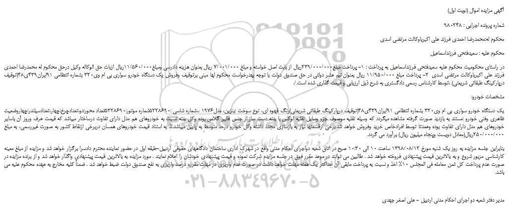 در راستای محکومیت محکوم علیه سعیدفتحی فرزنداسماعیل به پرداخت : 1- پرداخت مبلغ239/000/000ریال از بابت اصل خواسته و مبلغ 7/001/000 ریال بعنوان هزینه دادرسی ومبلغ11/560/000ریال ازبات حق الوکاله وکیل درحق محکوم له محمدرضا احمدی فرزند علی اکبرباوکالت مرتضی اسدی 2- پرداخت مبلغ 11/950/000 ریال بعنوان نیم عشر دولتی در حق صندوق دولت با توجه بهدرخواست محکوم لها مبنی برتوقیف وفروش یک دستگاه خودرو سواری بی ام وی320 بشماره انتظامی 91ایران439ی48(توقیف درپارکینگ طبقاتی شریعتی) ،توسط کارشناس رسمی دادگستری به شرح ذیل ارزیابی و قیمت گذاری شده است./.