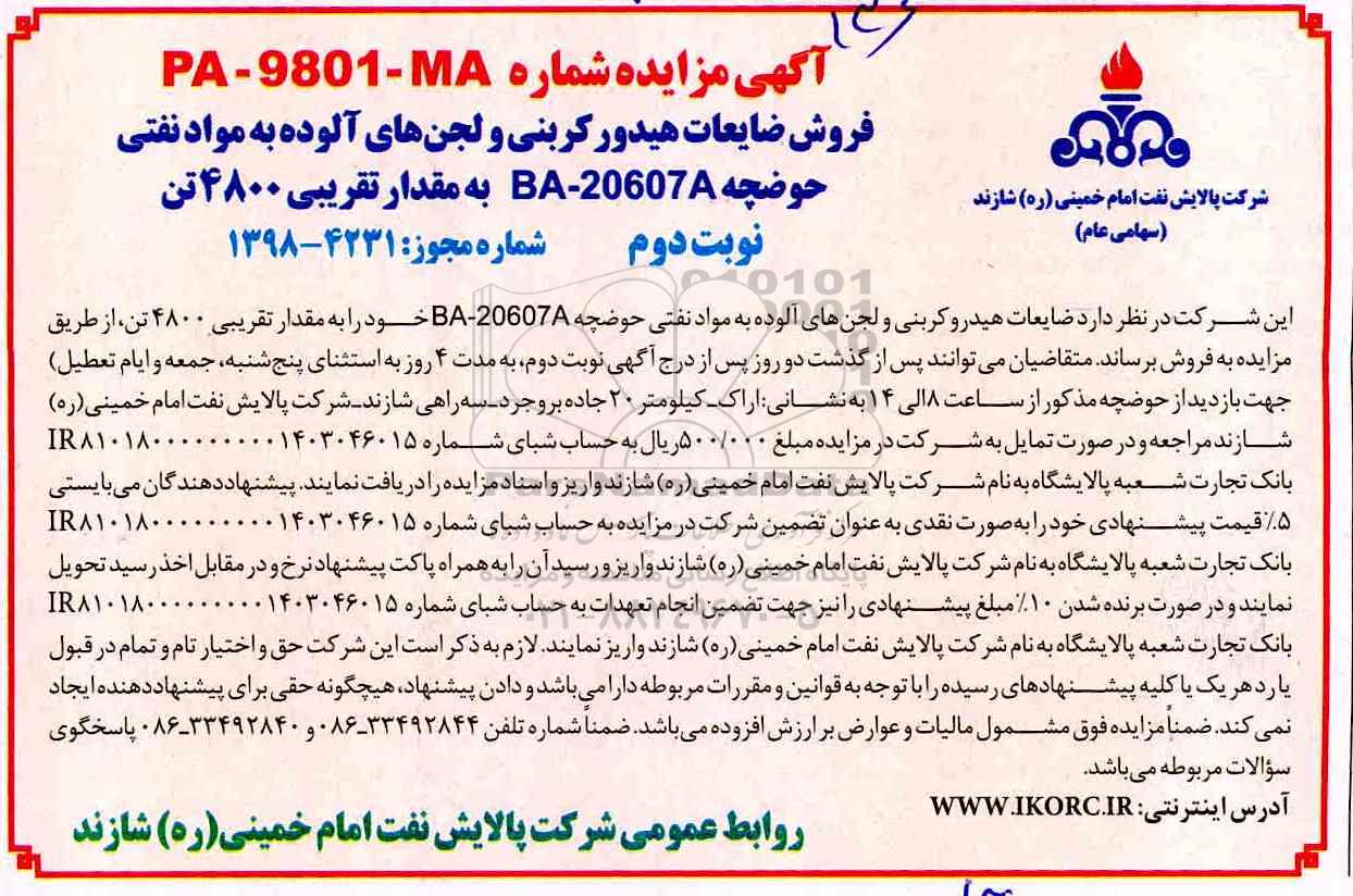 شرکت پالایش نفت امام خمینی (ره) شازند در نظر دارد ضایعات هیدرو کربنی و لجن های آلوده به مواد نفتی حوضچه BA-2607A خود را به مقدار تقریبی 4800 تن از طریق مزایده به فروش برساند. متقاضیان می توانند پس از گذشت دو روز پس از درج اگهی نوبت دوم به مدت 4 روز به استثناء پنجشنبه جمعه و ایام تعطیل جهت بازدید از حوضچه مذکور  از ساعت 8 الی 14 به نشانی اراک کیلومتر 20 جاده بروجرد سه راهی شازند شرکت پالایش نفت امام خمینی شازند مراجعه و در صورت تمایل به شرکت در مزایده مبلغ 500.000 ریال به حساب شبای شماره IR 810180000000001403046015 بانک تجارت شعبه پالایشگاه به نام شرکت پالایش نفت امام خمینی شازند واریز و اسناد مزایده را دریافت نمایند. پینشهاددهندگان می بایستی 5% قیمت پیشنهادی خود را به صورت نقدی به عنوان تضمین شرکت در مزایده به حساب شبای شماره  IR 810180000000001403046015 بانک تجارت شعبه پالایشگاه به نام شرکت پالایش نفت امام خمینی شازند واریز و رسید آن را به همراه پاکت پیشنهاد نرخ و در مقابل اخذ رسید تحویل نمایند و در صورت برنده شدن 10% مبلغ پیشنهادی را نیز جهت تضمین انجام تعهدات به حساب شبای شماره  IR 810180000000001403046015 بانک تجارت شعبه پالایشگاه به نام شرکت پالایش نفت امام خمینی شازند واریز نمایند لازم به ذکر است این شرکت حق و اختیار تام و تمام در قبول یا رد هر یک یا کلیه پیشنهادهای رسیده را با توجه به قوانین و مقررات مربوطه دارا می باشد و دادن پیشنهاد هیچگونه حقی برای پیشنهاددهنده ایجاد نمی کند ضمنا مزایده فوق مشمول مالیات و عوارض بر ارزش افزوده می باشد