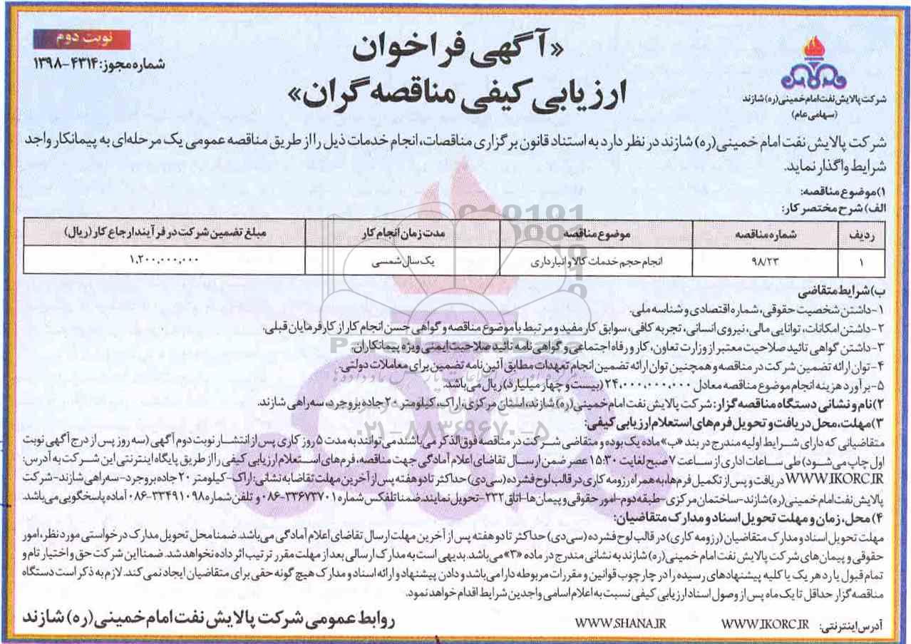 | 98/23 | انجام حجم خدمات کالا و انبارداری | یک سال شمسی | 1.200.000.000 |