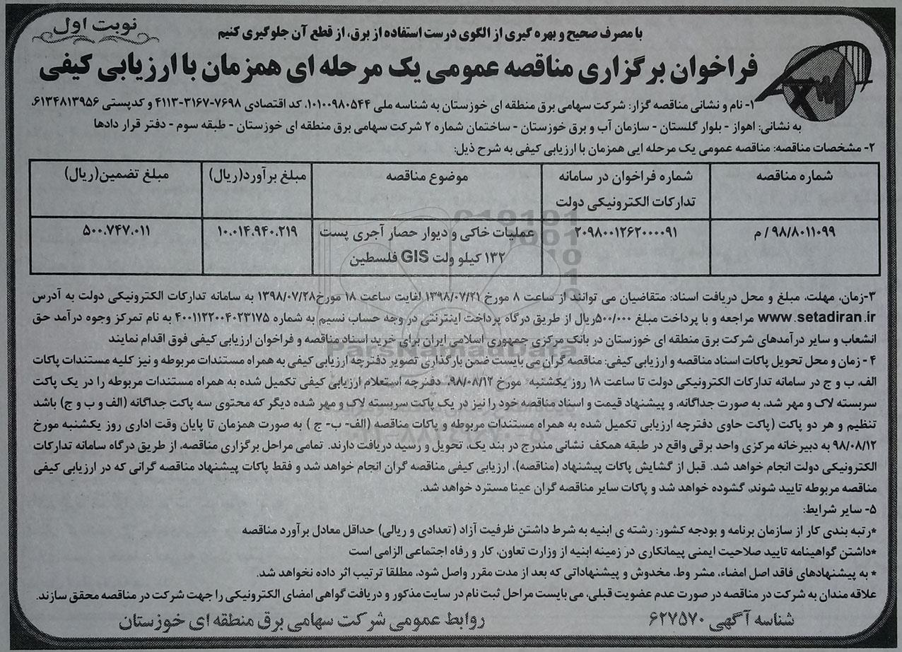 | 98/8011099/م | 2098001262000091 | عملیات خاکی و دیوار حصار آجری پست 132 کیلوولت GIS فلسطین |