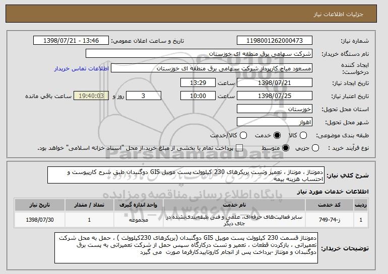 شرح کلی نیاز: دمونتاژ ، مونتاژ ، تعمیر وتست بریکرهای 230 کیلوولت پست موبیل GIS دوگنبدان طبق شرح کارپیوست و احتساب هزینه بیمه