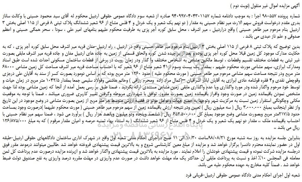 شماره پرونده 980557 اجرا : به موجب دادنامه شماره 9409970404301157 صادره از شعبه سوم دادگاه عمومی حقوقی اردبیل محکوم له آقای سید محمود حسینی با وکالت ساناز بدری مقدم درخواست فروش سهم الارث میر نظام حسینی به مقدار ( دو نهم یک شعیر و یک خردل و 4 فلس مشاع از 96 شعیر ششدانگ پلاک ثبتی 8 فرعی از 115 اصلی بخش 3 اردبیل بنام مرحوم میر طاهر حسینی ) واقع دراردبیل ، میر اشرف ، محل سابق کوره آجر پزی به طرفیت محکوم علیهم بنامهای امیر علی ، سودا ، سحر همگی حسینی و اعظم صدوقی و علم ناز عبدی می باشد .
