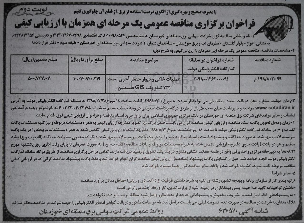 | 98/8011099/م | 2098001262000091 | عملیات خاکی و دیوار حصار آجری پست 132 کیلوولت GIS فلسطین |