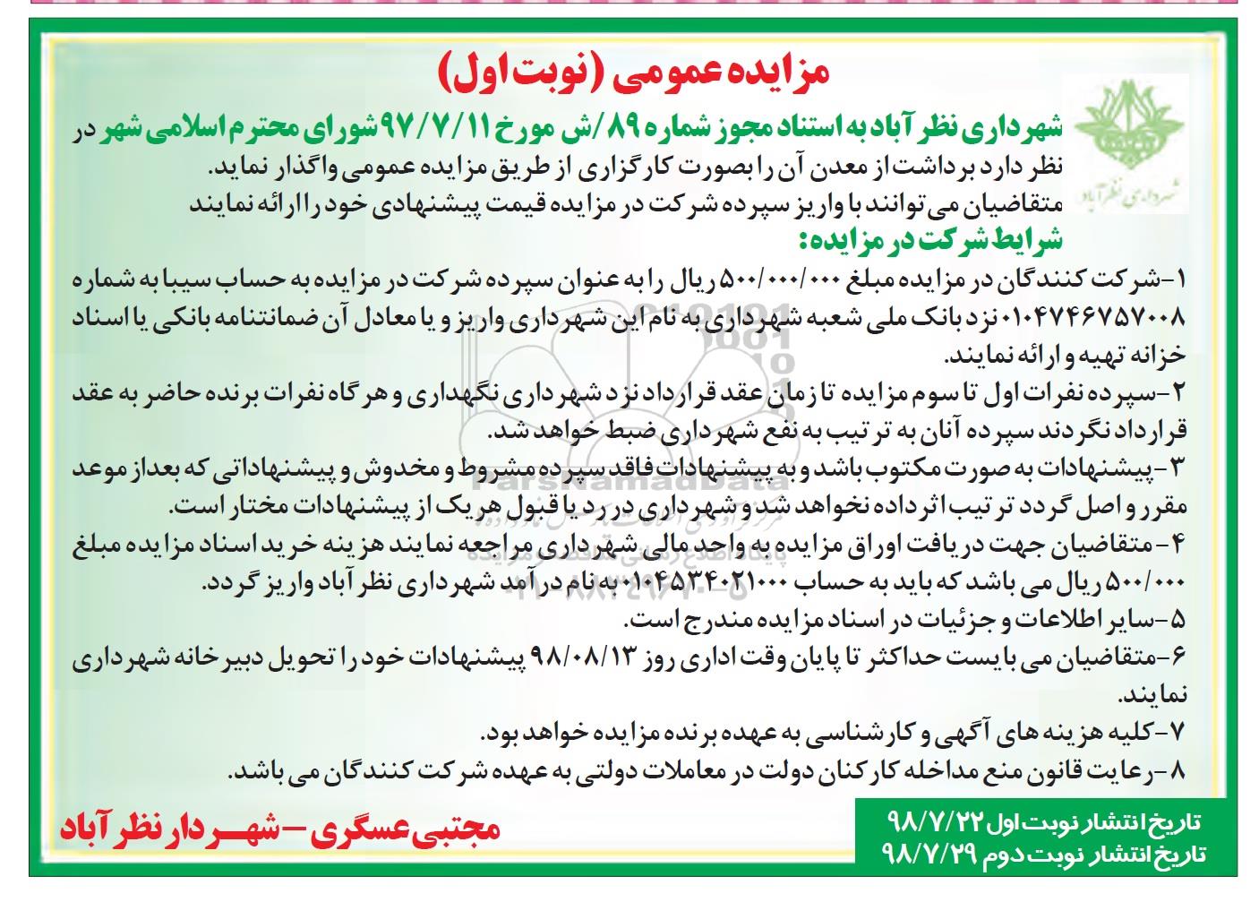 شهرداری نظرآباد به استناد مجوز شماره 89/ش مورخ 97.7.11 شورای محترم اسلامی شهر در در نظر دارد برداشت از معدن آن را بصورت کارگزاری از طریق مزایده عمومی واگذار نماید.