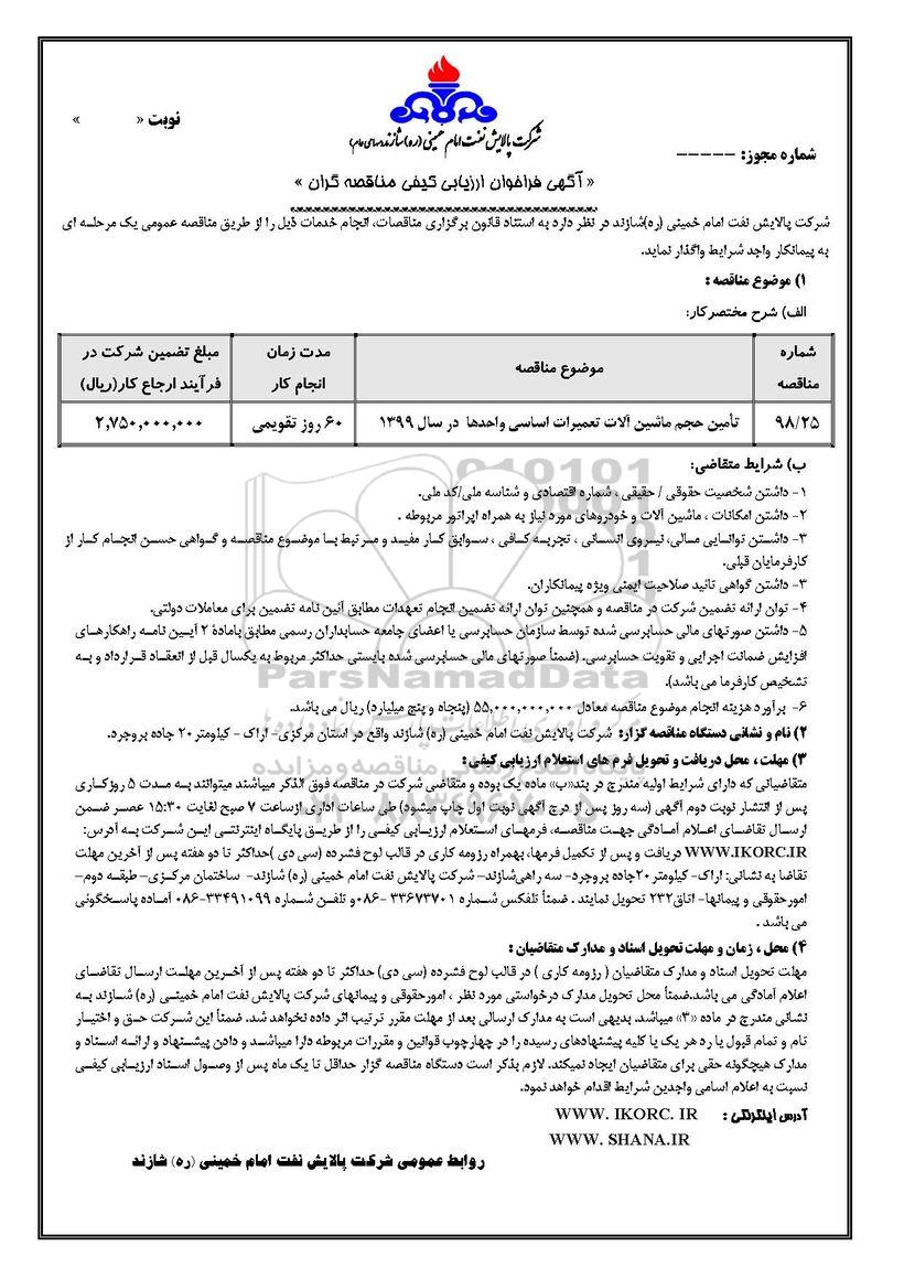 | 98/25 | تامین حجم ماشین آلات تعمیرات اساسی واحدهای در سال 1399 | 60 روز تقویمی | 2.750.000.000 |