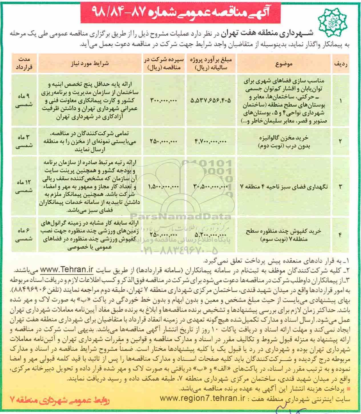 شهرداری منطقه هفت تهران در نظر دارد عملیات مشروح ذیل را از طریق برگزاری مناقصه عمومی طی یک مرحله به پیمانکار واگذار نماید. بدینوسیله از متقاضیان واجد شرایط جهت شرکت در مناقصه دعوت بعمل می آید