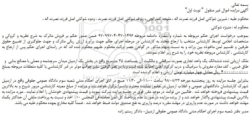 "آگهی مزایده اموال غیر منقول " نوبت اول
