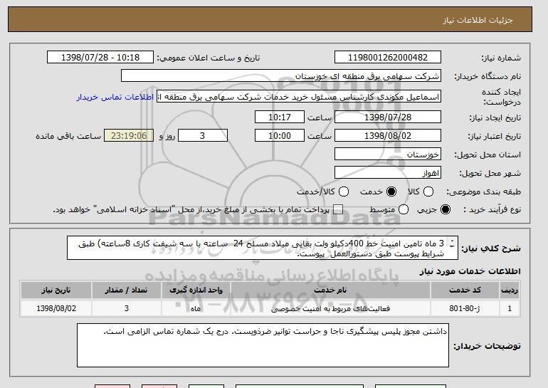 شرح کلی نیاز: 3 ماه تامین امنیت خط 400دکیلو ولت بقایی میلاد مسلح 24 ساعته با سه شیفت کاری 8ساعته) طبق شرایط پیوست طبق دستورالعمل پیوست.