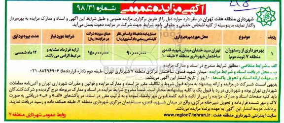 شهرداری منطقه هفت تهران در نظر دارد موارد ذیل را از طریق برگزاری مزایده عمومی و طبق شرایط این آگهی و اسناد و مدارک مزایده به بهره بردار واگذار نماید. بدینوسیله از کلیه اشخاص حقیقی و حقوقی واجد شرایط جهت شرکت در مزایده دعوت به عمل می آید