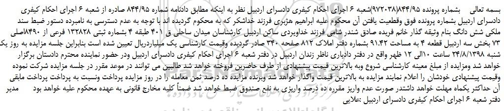 بسمه تعالی    بشماره پرونده 844/95(972038)شعبه 6 اجرای احکام کیفری دادسرای اردبیل نظر به اینکه مطابق دادنامه شماره 844/95 صادره از شعبه 6 اجرای احکام کیفری دادسرای اردبیل بشماره پرونده فوق وقطعیت یافتن آن محکوم علیه ابراهیم هژبری فرزند خداشکر که به محکوم گردیده اند با توجه به عدم دسترسی به نامبرده دستور ضبط سند ملکی شش دانگ بنام وثیقه گذار خانم فریده صادق شندر شامی فرزند خداویردی ساکن اردبیل کارشناسان میدان ساحلی ق 401 طبقه 4 بشماره ثبتی 132828 فرعی از 8490اصلی 73 بخش سه اردبیل قطعه 4 به مساحت 91.42 بشماره دفتر املاک 812 صفحه 340 صادر گردیده وقیمت کارشناسی یک میلیاردریال تعیین شده است بنابراین جلسه مزایده به روز یک شنبه 24/8/1398 ساعت 10الی 12 ظهر واقع در دفتر دادیاری ناظر زندان اردبیل در دفتر شعبه 6 اجرای احکام کیفری دادسرای اردبیل ودر حضور نماینده محترم دادستان برگزار خواهد شد ومزایده از مبلغ معینه کارشناسی شروع وبه بالاترین قیمت پیشنهادی از طرف حاضرین فروخته خواهد شد طالبین می توانند در موعد مقرر در جلسه مزایده شرکت نموده وقیمت پیشنهادی خودشان را اعلام نمایند مزایده به بالاترین قیمت واگذار خواهد شد وبرنده مزایده ده درصد ثمن معامله را در روز مزایده پرداخت ونسبت به پرداخت پرداخت مابقی آن حداکثر یکماه مهلت خواهد داشتدر صورت عدم واریز مقرره ده درصد واریزی به نفع صندوق ضبط خواهد شد ضمناً کلیه مخارج قانونی به عهده محکوم علیه خواهد بود