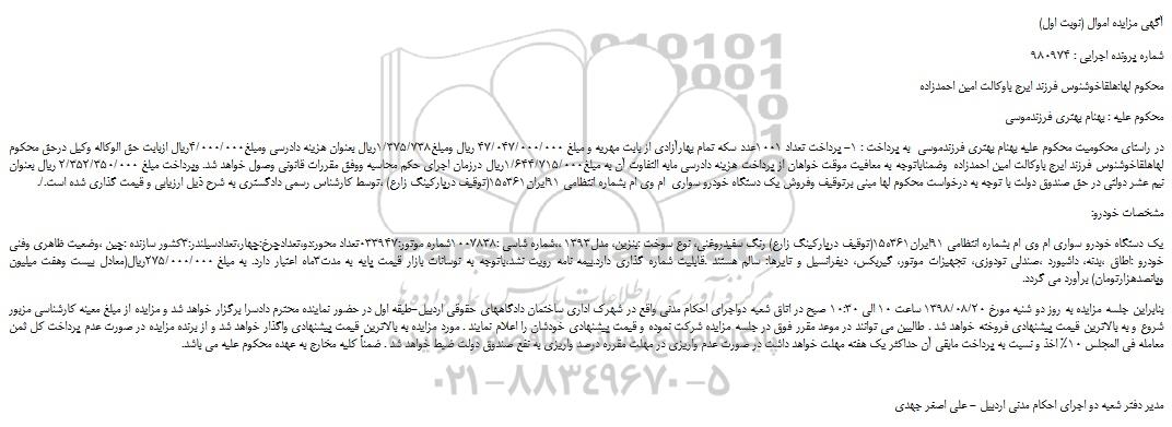 در راستای محکومیت محکوم علیه بهنام بهتری فرزندموسی به پرداخت : 1- پرداخت تعداد 1001عدد سکه تمام بهارآزادی از بابت مهریه و مبلغ 47/047/000/000 ریال ومبلغ1/375/738ریال بعنوان هزینه دادرسی ومبلغ4/000/000ریال ازبابت حق الوکاله وکیل درحق محکوم لهاهلقاخوشنوس فرزند ایرج باوکالت امین احمدزاده وضمناباتوجه به معافیت موقت خواهان از پرداخت هزینه دادرسی مابه التفاوت آن به مبلغ1/644/715/000ریال درزمان اجرای حکم محاسبه ووفق مقررات قانونی وصول خواهد شد. وپرداخت مبلغ 2/352/350/000 ریال بعنوان نیم عشر دولتی در حق صندوق دولت با توجه به درخواست محکوم لها مبنی برتوقیف وفروش یک دستگاه خودرو سواری ام وی ام بشماره انتظامی 91ایران361ه15(توقیف درپارکینگ زارع) ،توسط کارشناس رسمی دادگستری به شرح ذیل ارزیابی و قیمت گذاری شده است./.