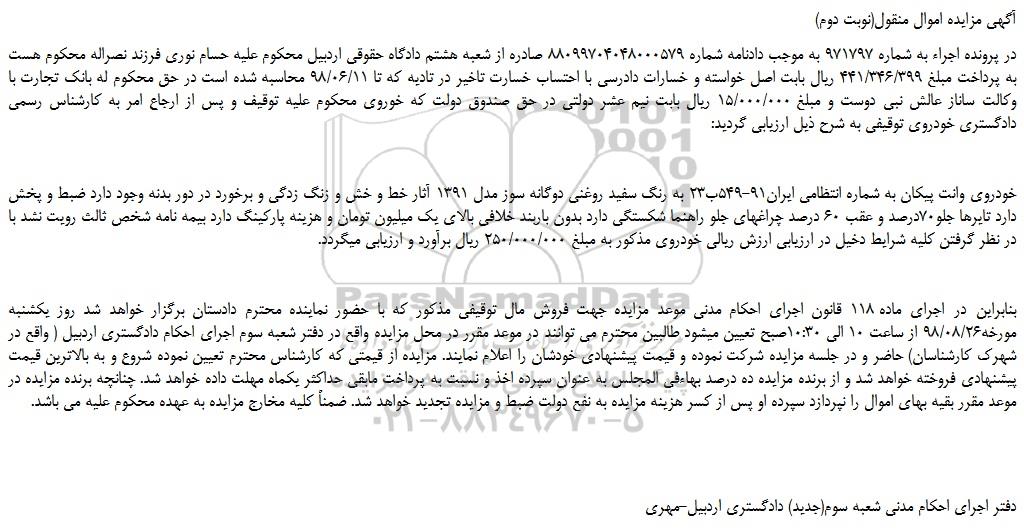 در پرونده اجراء به شماره 971797 به موجب دادنامه شماره 88099704048000579 صادره از شعبه هشتم دادگاه حقوقی اردبیل محکوم علیه حسام نوری فرزند نصراله محکوم هست به پرداخت مبلغ 441/346/399 ریال بابت اصل خواسته و خسارات دادرسی با احتساب خسارت تاخیر در تادیه که تا 98/06/11 محاسبه شده است در حق محکوم له بانک تجارت با وکالت ساناز عالش نبی دوست و مبلغ 15/000/000 ریال بابت نیم عشر دولتی در حق صندوق دولت که خوروی محکوم علیه توقیف و پس از ارجاع امر به کارشناس رسمی دادگستری خودروی توقیفی به شرح ذیل ارزیابی گردید: