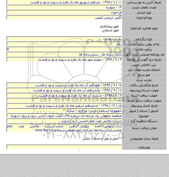مناقصه, مناقصه عمومی یک مرحله ای شماره ۲۰/۹۸تحت عنوان آژانس درون و برون شهری از کلیه افراد متخصص و شرکت‌ها واجد شرایط دعوت به عمل می‌آید در مناقصه با کد خبرگزاری پارس نماد: 1962970 شرکت نمایند. این مناقصه در تاریخ 1398/07/28 شروع و مهلت آن تا تاریخ 1398/09/06 میباشد.