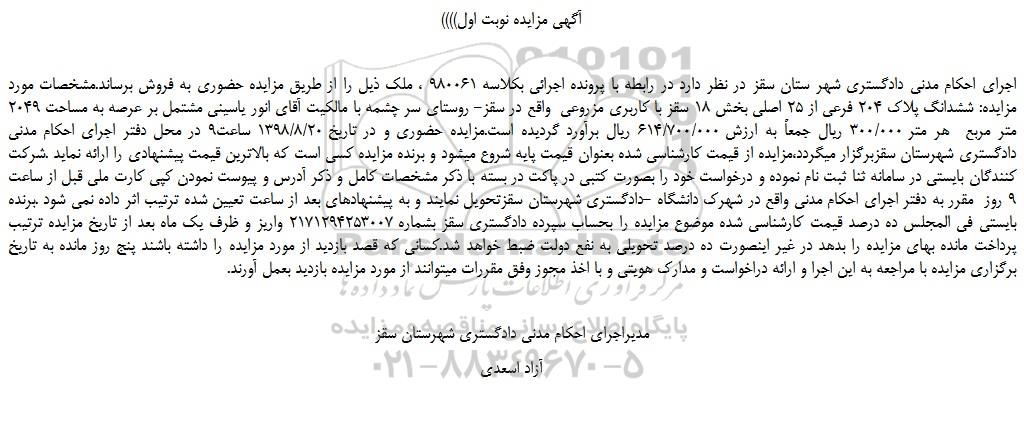 اجرای احکام مدنی دادگستری شهر ستان سقز در نظر دارد در رابطه با پرونده اجرائی بکلاسه 980061 ، ملک ذیل را از طریق مزایده حضوری به فروش برساند.مشخصات مورد مزایده: ششدانگ پلاک 204 فرعی از 25 اصلی بخش 18 سقز با کاربری مزروعی واقع در سقز- روستای سر چشمه با مالکیت آقای انور یاسینی مشتمل بر عرصه به مساحت 2049 متر مربع هر متر 300/000 ریال جمعاً به ارزش 614/700/000 ریال برآورد گردیده است.مزایده حضوری و در تاریخ 1398/8/20 ساعت9 در محل دفتر اجرای احکام مدنی دادگستری شهرستان سقزبرگزار میگردد،مزایده از قیمت کارشناسی شده بعنوان قیمت پایه شروع میشود و برنده مزایده کسی است که بالاترین قیمت پیشنهادی را ارائه نماید .شرکت کنندگان بایستی در سامانه ثنا ثبت نام نموده و درخواست خود را بصورت کتبی در پاکت در بسته با ذکر مشخصات کامل و ذکر آدرس و پیوست نمودن کپی کارت ملی قبل از ساعت 9 روز مقرر به دفتر اجرای احکام مدنی واقع در شهرک دانشگاه -دادگستری شهرستان سقزتحویل نمایند و به پیشنهادهای بعد از ساعت تعیین شده ترتیب اثر داده نمی شود .برنده بایستی فی المجلس ده درصد قیمت کارشناسی شده موضوع مزایده را بحساب سپرده دادگستری سقز بشماره 2171294253007 واریز و ظرف یک ماه بعد از تاریخ مزایده ترتیب پرداخت مانده بهای مزایده را بدهد در غیر اینصورت ده درصد تحویلی به نفع دولت ضبط خواهد شد.کسانی که قصد بازدید از مورد مزایده را داشته باشند پنج روز مانده به تاریخ برگزاری مزایده با مراجعه به این اجرا و ارائه دراخواست و مدارک هویتی و با اخذ مجوز وفق مقررات میتوانند از مورد مزایده بازدید بعمل آورند.