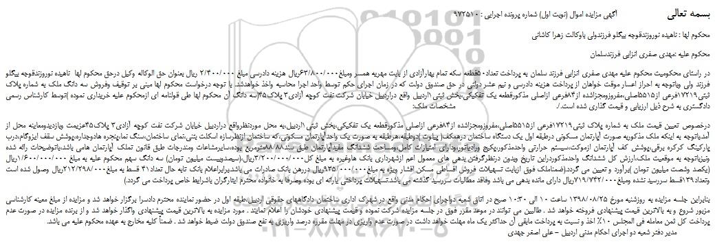 بسمه تعالی                        آگهی مزایده اموال (نوبت اول) شماره پرونده اجرایی : 972510