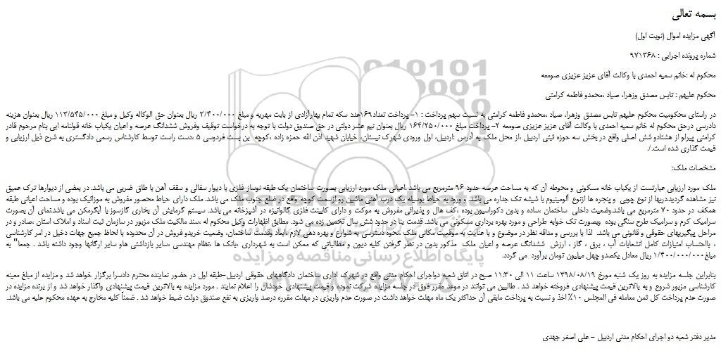 در راستای محکومیت محکوم علیهم تابس مصدق وزهرا، صیاد ،محمدو فاطمه کرامتی به نسبت سهم پرداخت : 1- پرداخت تعداد169عدد سکه تمام بهارآزادی از بابت مهریه و مبلغ 2/400/000 ریال بعنوان حق الوکاله وکیل و مبلغ 113/545/000 ریال بعنوان هزینه دادرسی درحق محکوم له خانم سمیه احمدی با وکالت آقای عزیز عزیزی صومعه 2- پرداخت مبلغ 164/250/000 ریال بعنوان نیم عشر دولتی در حق صندوق دولت با توجه به درخواست توقیف وفروش ششدانگ عرصه و اعیان یکباب خانه قولنامه ایی بنام مرحوم قادر کرامتی پیرلو از هشتادو شش اصلی واقع در بخش سه حوزه ثبتی اردبیل ،از محل ملک به آدرس :اردبیل، اول ورودی شهرک نیستان، خیابان شهید اذن الله حمزه زاده ،کوچه بن بست فردوسی 5 ،دست راست توسط کارشناس رسمی دادگستری به شرح ذیل ارزیابی و قیمت گذاری شده است./.