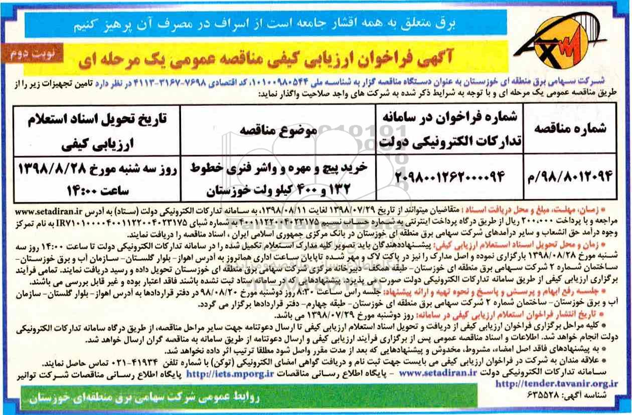 شرکت سهامی برق منطقه ای خوزستان به عنوان دستگاه مناقصه گزار به شناسه ملی 10100980544، کد اقتصادی 7698- 3167- 4113 در نظر دارد تامین تجهیزات زیر را از طریق مناقصه عمومی و با توجه به شرایط ذکر شده به شرکتهای واجد صلاحیت واگذار نماید: