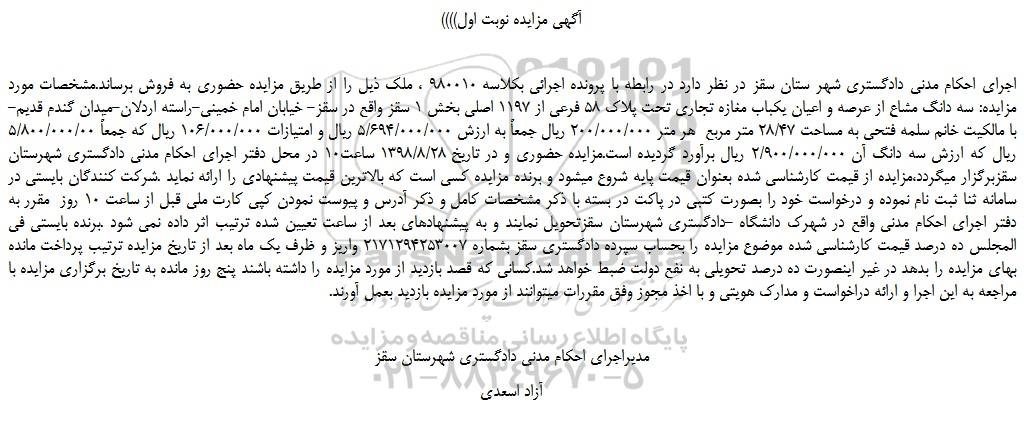 اجرای احکام مدنی دادگستری شهر ستان سقز در نظر دارد در رابطه با پرونده اجرائی بکلاسه 980010 ، ملک ذیل را از طریق مزایده حضوری به فروش برساند.مشخصات مورد مزایده: سه دانگ مشاع از عرصه و اعیان یکباب مغازه تجاری تحت پلاک 58 فرعی از 1197 اصلی بخش 1 سقز واقع در سقز- خیابان امام خمینی-راسته اردلان-میدان گندم قدیم- با مالکیت خانم سلمه فتحی به مساحت 28/47 متر مربع  هر متر 200/000/000 ریال جمعاً به ارزش 5/694/000/000 ریال و امتیازات 106/000/000 ریال که جمعاً 5/800/000/00 ریال که ارزش سه دانگ آن 2/900/000/000 ریال برآورد گردیده است.مزایده حضوری و در تاریخ 1398/8/28 ساعت10 در محل دفتر اجرای احکام مدنی دادگستری شهرستان سقزبرگزار میگردد،مزایده از قیمت کارشناسی شده بعنوان قیمت پایه شروع میشود و برنده مزایده کسی است که بالاترین قیمت پیشنهادی را ارائه نماید .شرکت کنندگان بایستی در سامانه ثنا ثبت نام نموده و درخواست خود را بصورت کتبی در پاکت در بسته با ذکر مشخصات کامل و ذکر آدرس و پیوست نمودن کپی کارت ملی قبل از ساعت 10 روز  مقرر به دفتر اجرای احکام مدنی واقع در شهرک دانشگاه -دادگستری شهرستان سقزتحویل نمایند و به پیشنهادهای بعد از ساعت تعیین شده ترتیب اثر داده نمی شود .برنده بایستی فی المجلس ده درصد قیمت کارشناسی شده موضوع مزایده را بحساب سپرده دادگستری سقز بشماره 2171294253007 واریز و ظرف یک ماه بعد از تاریخ مزایده ترتیب پرداخت مانده بهای مزایده را بدهد در غیر اینصورت ده درصد تحویلی به نفع دولت ضبط خواهد شد.کسانی که قصد بازدید از مورد مزایده را داشته باشند پنج روز مانده به تاریخ برگزاری مزایده با مراجعه به این اجرا و ارائه دراخواست و مدارک هویتی و با اخذ مجوز وفق مقررات میتوانند از مورد مزایده بازدید بعمل آورند.