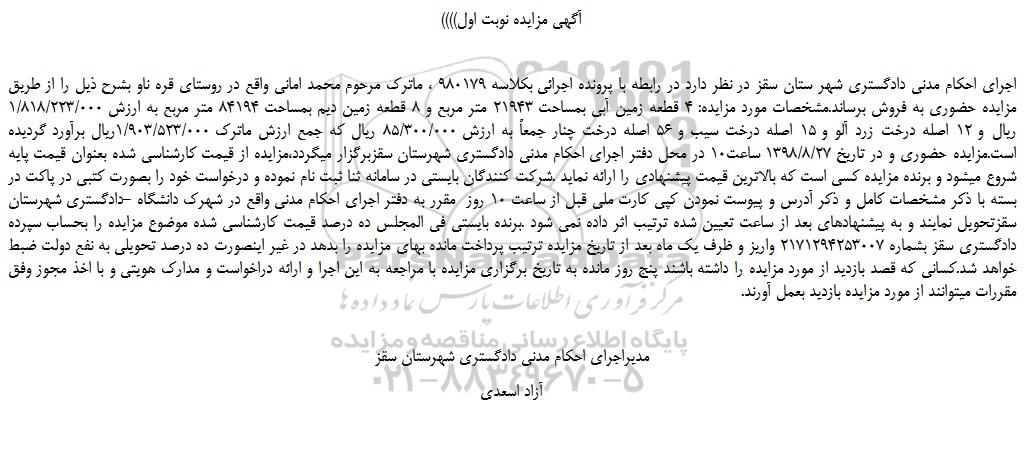 اجرای احکام مدنی دادگستری شهر ستان سقز در نظر دارد در رابطه با پرونده اجرائی بکلاسه 980179 ، ماترک مرحوم محمد امانی واقع در روستای قره ناو بشرح ذیل را از طریق مزایده حضوری به فروش برساند.مشخصات مورد مزایده: 4 قطعه زمین آبی بمساحت 21943 متر مربع و 8 قطعه زمین دیم بمساحت 84194 متر مربع به ارزش 1/818/223/000 ریال و 12 اصله درخت زرد آلو و 15 اصله درخت سیب و 56 اصله درخت چنار جمعاً به ارزش 85/300/000 ریال که جمع ارزش ماترک 1/903/523/000ریال برآورد گردیده است.مزایده حضوری و در تاریخ 1398/8/27 ساعت10 در محل دفتر اجرای احکام مدنی دادگستری شهرستان سقزبرگزار میگردد،مزایده از قیمت کارشناسی شده بعنوان قیمت پایه شروع میشود و برنده مزایده کسی است که بالاترین قیمت پیشنهادی را ارائه نماید .شرکت کنندگان بایستی در سامانه ثنا ثبت نام نموده و درخواست خود را بصورت کتبی در پاکت در بسته با ذکر مشخصات کامل و ذکر آدرس و پیوست نمودن کپی کارت ملی قبل از ساعت 10 روز مقرر به دفتر اجرای احکام مدنی واقع در شهرک دانشگاه -دادگستری شهرستان سقزتحویل نمایند و به پیشنهادهای بعد از ساعت تعیین شده ترتیب اثر داده نمی شود .برنده بایستی فی المجلس ده درصد قیمت کارشناسی شده موضوع مزایده را بحساب سپرده دادگستری سقز بشماره 2171294253007 واریز و ظرف یک ماه بعد از تاریخ مزایده ترتیب پرداخت مانده بهای مزایده را بدهد در غیر اینصورت ده درصد تحویلی به نفع دولت ضبط خواهد شد.کسانی که قصد بازدید از مورد مزایده را داشته باشند پنج روز مانده به تاریخ برگزاری مزایده با مراجعه به این اجرا و ارائه دراخواست و مدارک هویتی و با اخذ مجوز وفق مقررات میتوانند از مورد مزایده بازدید بعمل آورند.