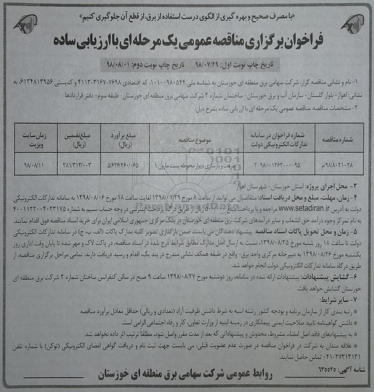 98/8021028/م 2098001262000095 مرمت و بازسازی دیوار محوطه پست مارون 1 5.626.260.065 281.313.003 98.8.11