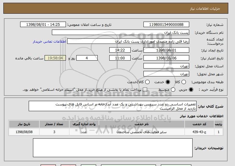 استعلام بها و موضوع استعلام استعلام تعمیرات اساسی دو عدد سرویس بهداشتی و یک عدد آبدارخانه بر اساس فایل های پیوست بازدید از محل الزامیست به اطلاع کلیه شرکتها و افراد متخصص واجد شرایط میرساند، آگهی گذار در نظر دارد از طریق استعلام بها، نسبت به انتخاب و دریافت پیشنهادات اقدام نماید. این استعلام با کد آگهی ثبت شده در سامانه خبرگزاری پارس نماد : 1971699 منتشر شده است. مشخصات استعلام : تاریخ شروع استعلام: 1398/08/01 آخرین مهلت ارسال پیشنهاد قیمت : 1398/08/05 و محل اجرای پروژه : استان تهران میباشد. استعلام قیمت مورد درخواست : استعلام تعمیرات اساسی دو عدد سرویس بهداشتی و یک عدد آبدارخانه بر اساس فایل های پیوست بازدید از محل الزامیست با دستهبندیهای تخصصی و گروه های مرتبط : ساختمان, استعلام اطلاع رسانی میگردد.