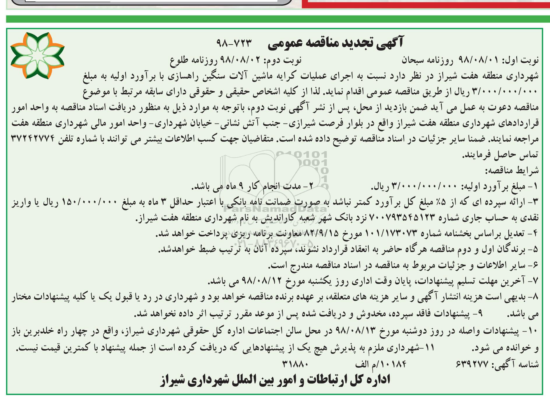 شهرداری منطقه هفت شیراز در نظر دارد نسبت به اجرای عملیات کرایه ماشین