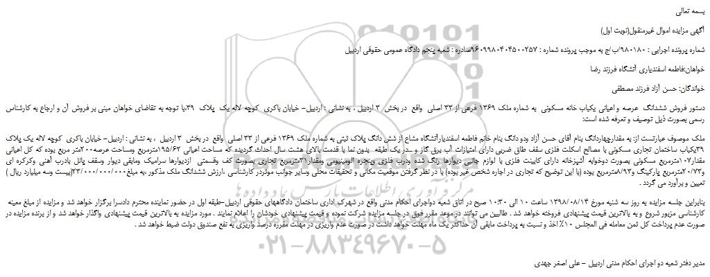 شماره پرونده اجرایی : 980180/ب/ج به موجب پرونده شماره : 9609980404500257صادره : شعبه پنجم دادگاه عمومی حقوقی اردبیل