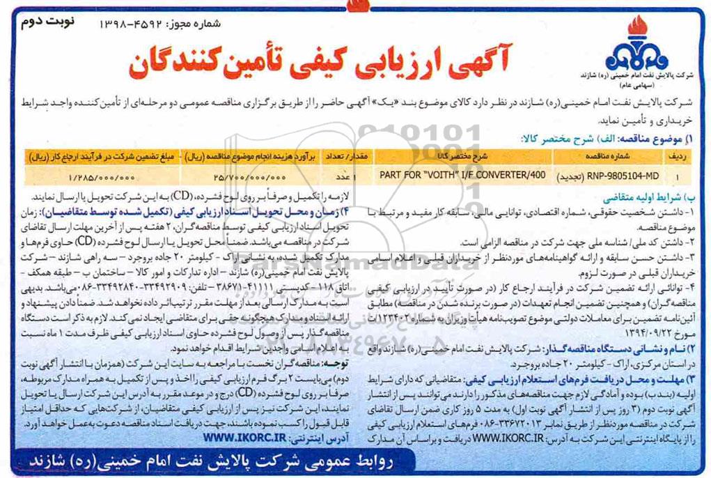 شرکت پالایش نفت امام خمینی (ره) شازند در نظر دارد کالاهای موضوع بند یک اگهی حاضر را از طریق مناقصه عمومی دو مرحله ای از تامین کننده واجد شرایط خریداری و تامین نماید