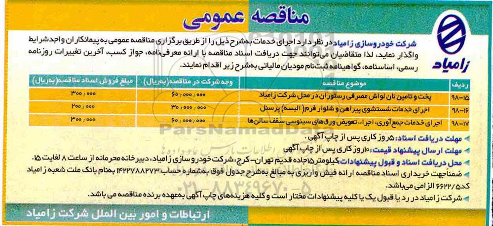 | 98-15 | پخت و نامین نان لواش مصرفی رستوران در محل شرکت زامیاد |