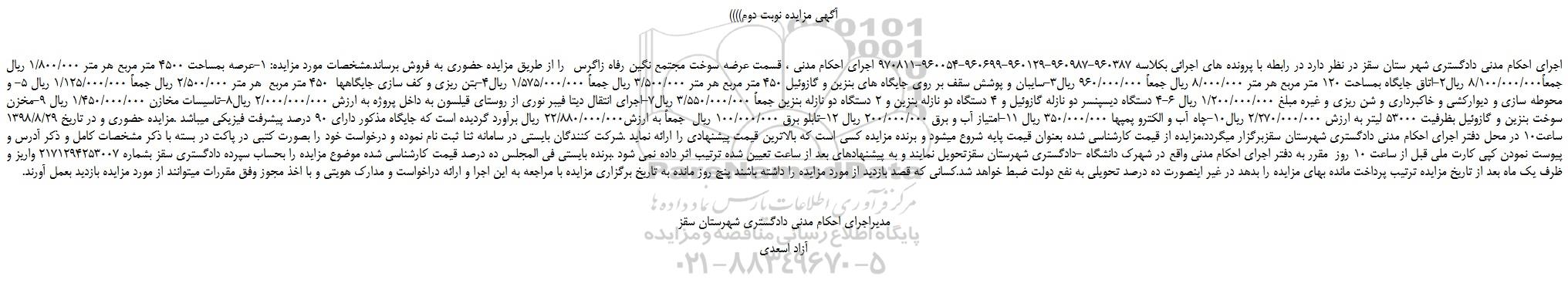 اجرای احکام مدنی دادگستری شهر ستان سقز در نظر دارد در رابطه با پرونده های اجرائی بکلاسه 960387-960987-960129-960699-960054-970811 اجرای احکام مدنی ، قسمت عرضه سوخت مجتمع نگین رفاه زاگرس را از طریق مزایده حضوری به فروش برساند.مشخصات مورد مزایده: 1-عرصه بمساحت 4500 متر مربع هر متر 1/800/000 ریال جمعاً8/100/000/000 ریال2-اتاق جایگاه بمساحت 120 متر مربع هر متر 8/000/000 ریال جمعاً 960/000/000 ریال3-سایبان و پوشش سقف بر روی جایگاه های بنزین و گازوئیل 450 متر مربع هر متر 3/500/000 ریال جمعاً 1/575/000/000 ریال4-بتن ریزی و کف سازی جایگاهها 450 متر مربع هر متر 2/500/000 ریال جمعاً 1/125/000/000 ریال 5- و محوطه سازی و دیوارکشی و خاکبرداری و شن ریزی و غیره مبلغ 1/200/000/000 ریال 6-4 دستگاه دیسپنسر دو نازله گازوئیل و 4 دستگاه دو نازله بنزین و 2 دستگاه دو نازله بنزین جمعاً 3/550/000/000 ریال7-اجرای انتقال دیتا فیبر نوری از روستای قیلسون به داخل پروژه به ارزش 2/000/000/000 ریال8-تاسیسات مخازن 1/450/000/000 ریال 9-مخزن سوخت بنزین و گازوئیل بظرفیت 53000 لیتر به ارزش 2/270/000/000 ریال10-چاه آب و الکترو پمپها 350/000/000 ریال 11-امتیاز آب و برق 200/000/000 ریال 12-تابلو برق 100/000/000 ریال جمعاً به ارزش22/880/000/000 ریال برآورد گردیده است که جایگاه مذکور دارای 90 درصد پیشرفت فیزیکی میباشد .مزایده حضوری و در تاریخ 1398/8/29 ساعت10 در محل دفتر اجرای احکام مدنی دادگستری شهرستان سقزبرگزار میگردد،مزایده از قیمت کارشناسی شده بعنوان قیمت پایه شروع میشود و برنده مزایده کسی است که بالاترین قیمت پیشنهادی را ارائه نماید .شرکت کنندگان بایستی در سامانه ثنا ثبت نام نموده و درخواست خود را بصورت کتبی در پاکت در بسته با ذکر مشخصات کامل و ذکر آدرس و پیوست نمودن کپی کارت ملی قبل از ساعت 10 روز مقرر به دفتر اجرای احکام مدنی واقع در شهرک دانشگاه -دادگستری شهرستان سقزتحویل نمایند و به پیشنهادهای بعد از ساعت تعیین شده ترتیب اثر داده نمی شود .برنده بایستی فی المجلس ده درصد قیمت کارشناسی شده موضوع مزایده را بحساب سپرده دادگستری سقز بشماره 2171294253007 واریز و ظرف یک ماه بعد از تاریخ مزایده ترتیب پرداخت مانده بهای مزایده را بدهد در غیر اینصورت ده درصد تحویلی به نفع دولت ضبط خواهد شد.کسانی که قصد بازدید از مورد مزایده را داشته باشند پنج روز مانده به تاریخ برگزاری مزایده با مراجعه به این اجرا و ارائه دراخواست و مدارک هویتی و با اخذ مجوز وفق مقررات میتوانند از مورد مزایده بازدید بعمل آورند.