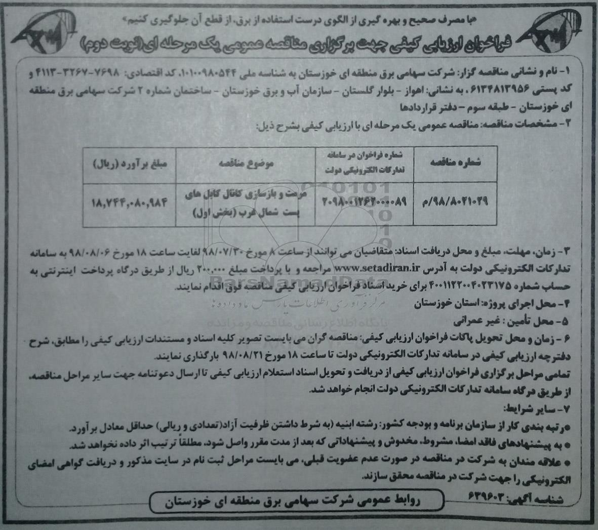 نام و نشانی مناقصه گزار : شرکت سهامی برق منطقه ای خوزستان به شناسه ملی 10100980544، کد اقتصادی 7698- 3267- 4113 کد پستی 6134813956 به نشانی اهواز بلوار گلستان سازمان آب وبرق خوزستان ساختمان شماره 2 شرکت سهامی برق م نطقه ای خوزستان ط سوم دفتر قراردادها