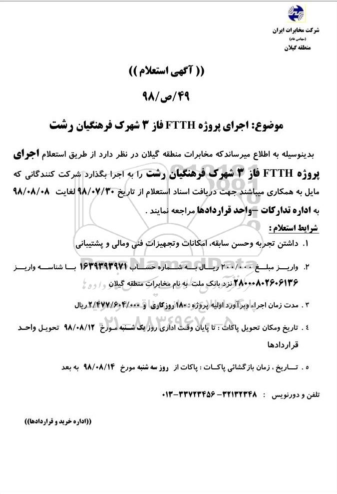 بدینوسیله به اطلاع میرساند که مخابرات منطقه گیلان در نظر دارد از طریق استعلام اجرای پروژه FTTH فاز 3 شهرک فرهنگیان رشت را به اجرا بگذارد شرکت کنندگانی که مایل به همکاری میباشند جهت دریافت اسناد استعلام از تاریخ 98.7.30 لغایت 98.8.8 به اداره تدارکات - واحد قراردادها مراجعه نمایند
