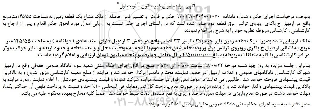 بموجب درخواست اجرای حکم و شماره دادنامه 9709970404801070 حکم بر فروش و تقسیم ثمن حاصله از ملک مشاع یک قطعه زمین به مساحت 145/55مترمربع واقع در اردبیل خ باکری روبروی ترانس برق قطعه دوم صادر شده است که در راستای اجرای حکم نسبت به ارزیابی اموال مورد لحوق حکم اقدام و پس از ارجاع به کارشناسی ، کارشناس مربوطه نظریه خود را به شرح زیر اعلام نمودند: