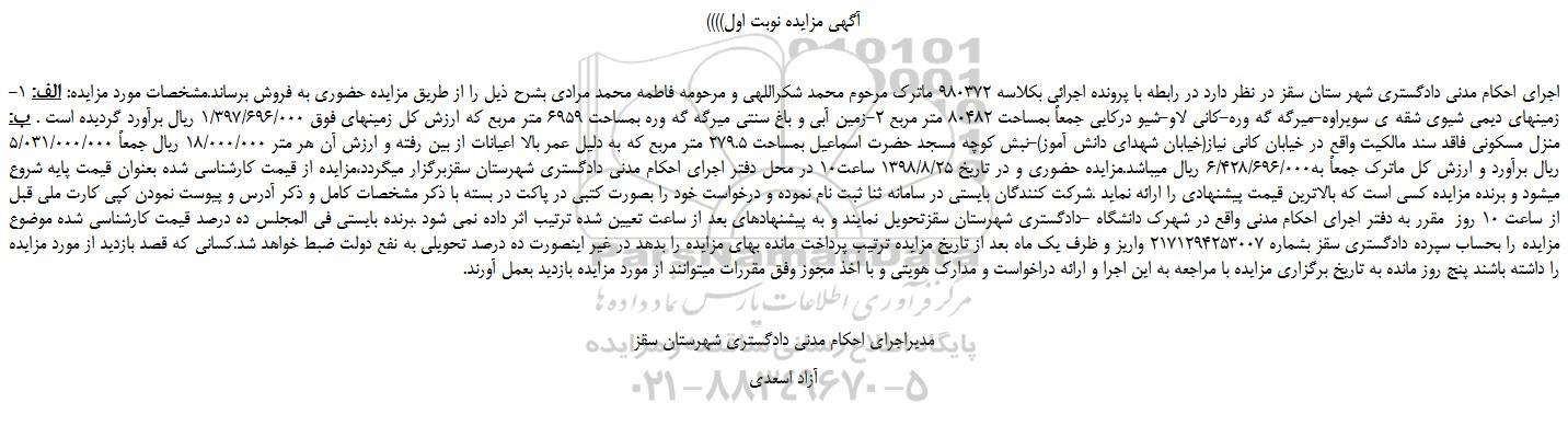 اجرای احکام مدنی دادگستری شهر ستان سقز در نظر دارد در رابطه با پرونده اجرائی بکلاسه 980372 ماترک مرحوم محمد شکراللهی و مرحومه فاطمه محمد مرادی بشرح ذیل را از طریق مزایده حضوری به فروش برساند.مشخصات مورد مزایده: الف: 1- زمینهای دیمی شیوی شقه ی سویراوه-میرگه گه وره-کانی لاو-شیو درکایی جمعاً بمساحت 80482 متر مربع 2-زمین آبی و باغ سنتی میرگه گه وره بمساحت 6959 متر مربع که ارزش کل زمینهای فوق 1/397/696/000 ریال برآورد گردیده است . ب: منزل مسکونی فاقد سند مالکیت واقع در خیابان کانی نیاز(خیابان شهدای دانش آموز)-نبش کوچه مسجد حضرت اسماعیل بمساحت 279.5 متر مربع که به دلیل عمر بالا اعیانات از بین رفته و ارزش آن هر متر 18/000/000 ریال جمعاً 5/031/000/000 ریال برآورد و ارزش کل ماترک جمعاً به6/428/696/000 ریال میباشد.مزایده حضوری و در تاریخ 1398/8/25 ساعت10 در محل دفتر اجرای احکام مدنی دادگستری شهرستان سقزبرگزار میگردد،مزایده از قیمت کارشناسی شده بعنوان قیمت پایه شروع میشود و برنده مزایده کسی است که بالاترین قیمت پیشنهادی را ارائه نماید .شرکت کنندگان بایستی در سامانه ثنا ثبت نام نموده و درخواست خود را بصورت کتبی در پاکت در بسته با ذکر مشخصات کامل و ذکر آدرس و پیوست نمودن کپی کارت ملی قبل از ساعت 10 روز  مقرر به دفتر اجرای احکام مدنی واقع در شهرک دانشگاه -دادگستری شهرستان سقزتحویل نمایند و به پیشنهادهای بعد از ساعت تعیین شده ترتیب اثر داده نمی شود .برنده بایستی فی المجلس ده درصد قیمت کارشناسی شده موضوع مزایده را بحساب سپرده دادگستری سقز بشماره 2171294253007 واریز و ظرف یک ماه بعد از تاریخ مزایده ترتیب پرداخت مانده بهای مزایده را بدهد در غیر اینصورت ده درصد تحویلی به نفع دولت ضبط خواهد شد.کسانی که قصد بازدید از مورد مزایده را داشته باشند پنج روز مانده به تاریخ برگزاری مزایده با مراجعه به این اجرا و ارائه دراخواست و مدارک هویتی و با اخذ مجوز وفق مقررات میتوانند از مورد مزایده بازدید بعمل آورند.