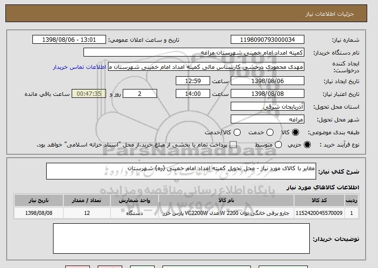 شرح کلی نیاز: مغایر با کالای مورد نیاز - محل تحویل کمیته امداد امام خمینی (ره) شهرستان
