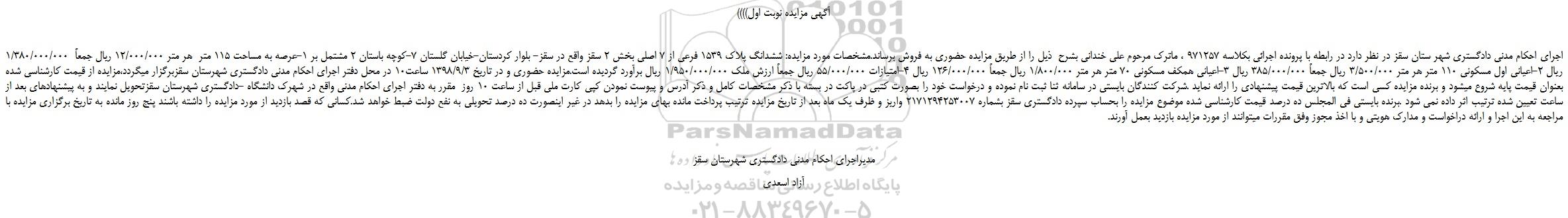 اجرای احکام مدنی دادگستری شهر ستان سقز در نظر دارد در رابطه با پرونده اجرائی بکلاسه 971257 ، ماترک مرحوم علی خندانی بشرح ذیل را از طریق مزایده حضوری به فروش برساند.مشخصات مورد مزایده: ششدانگ پلاک 1539 فرعی از 7 اصلی بخش 2 سقز واقع در سقز- بلوار کردستان-خیابان گلستان 7-کوچه باستان 2 مشتمل بر 1-عرصه به مساحت 115 متر هر متر 12/000/000 ریال جمعاً 1/380/000/000 ریال 2-اعیانی اول مسکونی 110 متر هر متر 3/500/000 ریال جمعاً 385/000/000 ریال 3-اعیانی همکف مسکونی 70 متر هر متر 1/800/000 ریال جمعاً 126/000/000 ریال 4-امتیازات 55/000/000 ریال جمعاً ارزش ملک 1/950/000/000 ریال برآورد گردیده است.مزایده حضوری و در تاریخ 1398/9/3 ساعت10 در محل دفتر اجرای احکام مدنی دادگستری شهرستان سقزبرگزار میگردد،مزایده از قیمت کارشناسی شده بعنوان قیمت پایه شروع میشود و برنده مزایده کسی است که بالاترین قیمت پیشنهادی را ارائه نماید .شرکت کنندگان بایستی در سامانه ثنا ثبت نام نموده و درخواست خود را بصورت کتبی در پاکت در بسته با ذکر مشخصات کامل و ذکر آدرس و پیوست نمودن کپی کارت ملی قبل از ساعت 10 روز مقرر به دفتر اجرای احکام مدنی واقع در شهرک دانشگاه -دادگستری شهرستان سقزتحویل نمایند و به پیشنهادهای بعد از ساعت تعیین شده ترتیب اثر داده نمی شود .برنده بایستی فی المجلس ده درصد قیمت کارشناسی شده موضوع مزایده را بحساب سپرده دادگستری سقز بشماره 2171294253007 واریز و ظرف یک ماه بعد از تاریخ مزایده ترتیب پرداخت مانده بهای مزایده را بدهد در غیر اینصورت ده درصد تحویلی به نفع دولت ضبط خواهد شد.کسانی که قصد بازدید از مورد مزایده را داشته باشند پنج روز مانده به تاریخ برگزاری مزایده با مراجعه به این اجرا و ارائه دراخواست و مدارک هویتی و با اخذ مجوز وفق مقررات میتوانند از مورد مزایده بازدید بعمل آورند.