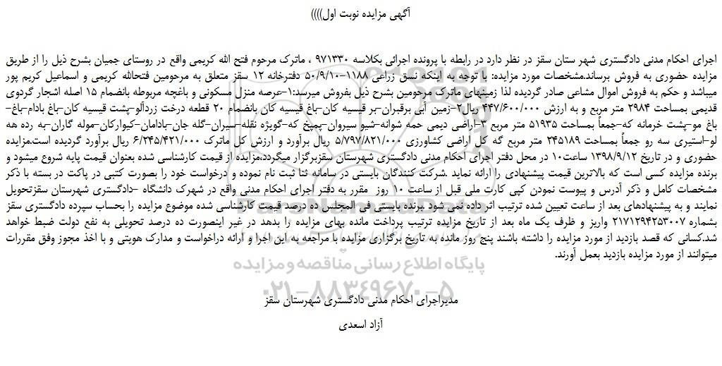 اجرای احکام مدنی دادگستری شهر ستان سقز در نظر دارد در رابطه با پرونده اجرائی بکلاسه 971330 ، ماترک مرحوم فتح الله کریمی واقع در روستای جمیان بشرح ذیل را از طریق مزایده حضوری به فروش برساند.مشخصات مورد مزایده: با توجه به اینکه نسق زراعی 1188-50/9/10 دفترخانه 12 سقز متعلق به مرحومین فتحالله کریمی و اسماعیل کریم پور میباشد و حکم به فروش اموال مشاعی صادر گردیده لذا زمینهای ماترک مرحومین بشرح ذیل بفروش میرسد:1-عرصه منزل مسکونی و باغچه مربوطه بانضمام 15 اصله اشجار گردوی قدیمی بمساحت 2984 متر مربع و به ارزش 447/600/000 ریال2-زمین آبی برقبران-بر قیسیه کان-باغ قیسیه کان بانضمام 20 قطعه درخت زردآلو-پشت قیسیه کان-باغ بادام-باغ-باغ مو-پشت خرمانه که-جمعاً بمساحت 51935 متر مربع 3-اراضی دیمی حمه شوانه-شیو سیروان-پمپخ که-گویژه نقله-سیران-گله جان-بادامان-کیوارکان-موله گاران-به رده هه لو-استیری سه رو جمعاً بمساحت 245189 متر مربع گه کل اراضی کشاورزی 5/797/821/000 ریال برآورد و ارزش کل ماترک 6/245/421/000 ریال برآورد گردیده است.مزایده حضوری و در تاریخ 1398/9/12 ساعت10 در محل دفتر اجرای احکام مدنی دادگستری شهرستان سقزبرگزار میگردد،مزایده از قیمت کارشناسی شده بعنوان قیمت پایه شروع میشود و برنده مزایده کسی است که بالاترین قیمت پیشنهادی را ارائه نماید .شرکت کنندگان بایستی در سامانه ثنا ثبت نام نموده و درخواست خود را بصورت کتبی در پاکت در بسته با ذکر مشخصات کامل و ذکر آدرس و پیوست نمودن کپی کارت ملی قبل از ساعت 10 روز  مقرر به دفتر اجرای احکام مدنی واقع در شهرک دانشگاه -دادگستری شهرستان سقزتحویل نمایند و به پیشنهادهای بعد از ساعت تعیین شده ترتیب اثر داده نمی شود .برنده بایستی فی المجلس ده درصد قیمت کارشناسی شده موضوع مزایده را بحساب سپرده دادگستری سقز بشماره 2171294253007 واریز و ظرف یک ماه بعد از تاریخ مزایده ترتیب پرداخت مانده بهای مزایده را بدهد در غیر اینصورت ده درصد تحویلی به نفع دولت ضبط خواهد شد.کسانی که قصد بازدید از مورد مزایده را داشته باشند پنج روز مانده به تاریخ برگزاری مزایده با مراجعه به این اجرا و ارائه دراخواست و مدارک هویتی و با اخذ مجوز وفق مقررات میتوانند از مورد مزایده بازدید بعمل آورند.