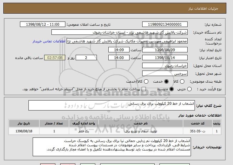 شرح کلی نیاز: انشعاب از خط 20 کیلوولت برای برق رسانی