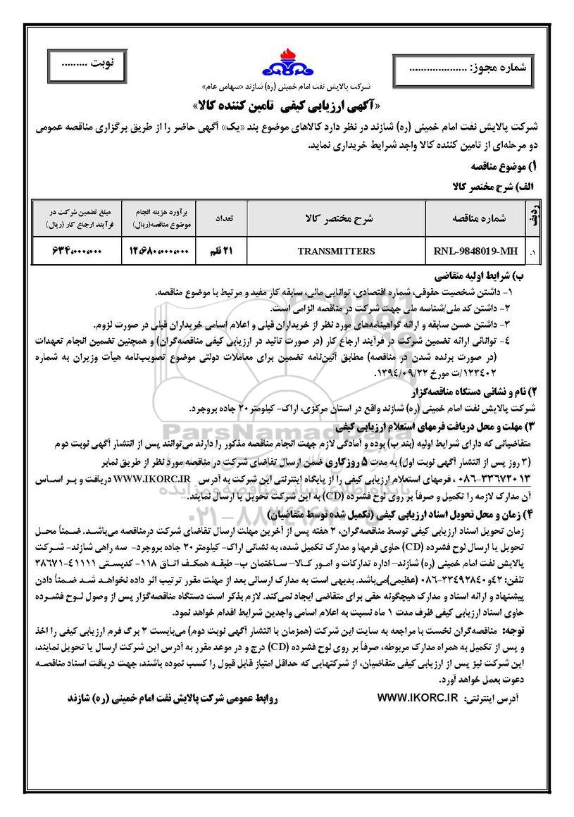 شرکت پالایش نفت امام خمینی (ره) شازند در نظر دارد کالاهای موضوع بند یک اگهی حاضر را از طریق مناقصه عمومی دو مرحله ای از تامین کننده واجد شرایط خریداری و تامین نماید