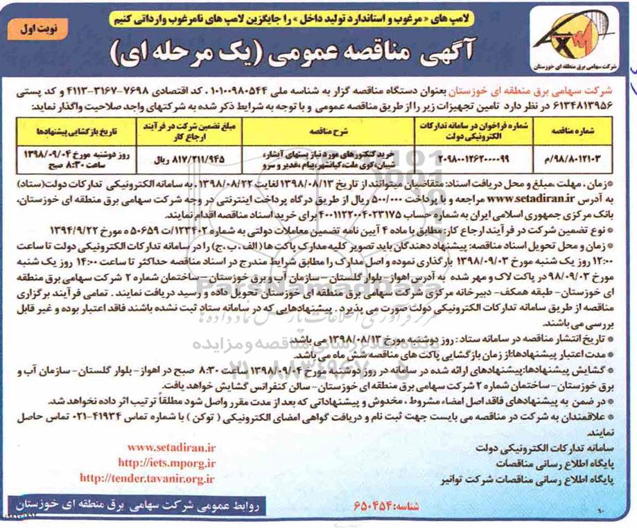 شرکت سهامی برق منطقه ای خوزستان بعنوان دستگاه مزایده گزار به شناسه ملی 10100980544 کد اقتصادی 4113-3167-7698 و کد پستی 6134813956  در نر دارد تامین تجهیزات زیر را از طریق مناقصه عمومی و با توجه به شرایط ذکر شده به شرکتهای واجد صلاحیت واگذار نماید