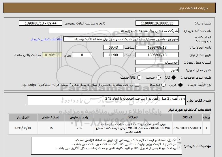 شرح کلی نیاز: ورق آهنی 3 میل (آهن نو ) ساخت اصفهان با ابعاد 1*2
