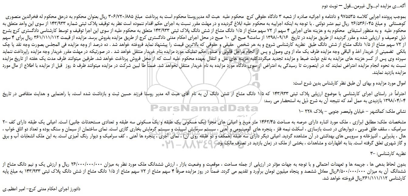 بموجب پرونده اجرایی کلاسه 975535 و دادنامه و اجرائیه صادره از شعبه 3 دادگاه حقوقی کرج  محکوم علیه  هبت اله مدیرروستا محکوم است به پرداخت  مبلغ 306/720/885 ریال بعنوان محکوم به درحق محکوم له فخرالدین منصوری کوهستانی  و مبلغ 26/536/045 ریال نیم عشر دولتی . با توجه به اینکه اجراییه به محکوم علیه ابلاغ گردیده و در مهلت مقرر نسبت به اجرای حکم اقدام ننموده است نظر به توقیف پلاک ثبتی شماره 143/933 از سوی این واحد متعلق به محکوم علیه  و به منظور استیفای  محکوم به و هزینه های اجرایی 4 سهم از 72 سهم مشاع از 1/5 دانگ مشاع از شش دانگ پلاک ثبتی 143/933 متعلق به محکوم علیه از سوی این اجرا توقیف و توسط کارشناسی دادگستری کرج بشرح ذیل توصیف و ارزیابی شده و مقرر گردیده از طریق مزایده در تاریخ  1398/09/16 از ساعت9 صبح الی 10 صبح در محل اجرای احکام مدنی دادگستری کرج از طریق مزایده بفروش برسد. مزایده از قیمت 361/111/112 ریال برای 4 سهم از 72 سهم مشاع از 1/5 دانگ مشاع از شش دانگ طبق  نظریه کارشناسی شروع و به هر شخص  حقیقی و حقوقی که بالاترین قیمت را پیشنهاد نماید فروخته خواهد شد . ده درصد از وجه مزایده فی المجلس بصورت وجه نقد یا چک بانکی  تضمینی از خریدار اخذ و الباقی وجه مزایده ظرف یک ماه از وی وصول و پس از انجام مراحل قانونی و صدور حکم تملیک مورد مزایده بنام خریدار منتقل خواهد شد . در صورتیکه در مهلت مقرر خریدار وجه مزایده راپرداخت ننماید سپرده وی پس از کسر هزینه های مزایده به نفع دولت ضبط و مزایده تجدید میگردد.کلیه هزینه های نقل و انتقال بعهده محکوم علیه است که از محل فروش پرداخت خواهد شد. طرفین میتوانند ظرف مدت یک هفته از تاریخ مزایده نسبت به نحوه انجام مزایده اعتراض نمایند که در اینصورت تا رسیدگی به اعتراض از سوی دادگاه مورد مزایده به نام خریدار منتقل نخواهد شد. ضمناً طا لبین شرکت در مزایده میتوانند ظرف 5 روز  قبل از مزایده با اطلاع از مال مورد مزایده بازدید نمایند.