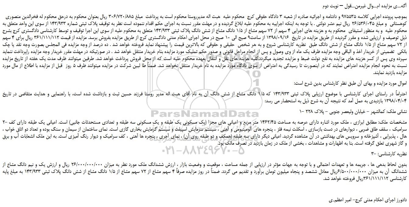 بموجب پرونده اجرایی کلاسه 975535 و دادنامه و اجرائیه صادره از شعبه 3 دادگاه حقوقی کرج محکوم علیه هبت اله مدیرروستا محکوم است به پرداخت مبلغ 306/720/885 ریال بعنوان محکوم به درحق محکوم له فخرالدین منصوری کوهستانی و مبلغ 26/536/045 ریال نیم عشر دولتی . با توجه به اینکه اجراییه به محکوم علیه ابلاغ گردیده و در مهلت مقرر نسبت به اجرای حکم اقدام ننموده است نظر به توقیف پلاک ثبتی شماره 143/933 از سوی این واحد متعلق به محکوم علیه و به منظور استیفای محکوم به و هزینه های اجرایی 4 سهم از 72 سهم مشاع از 1/5 دانگ مشاع از شش دانگ پلاک ثبتی 143/933 متعلق به محکوم علیه از سوی این اجرا توقیف و توسط کارشناسی دادگستری کرج بشرح ذیل توصیف و ارزیابی شده و مقرر گردیده از طریق مزایده در تاریخ 1398/09/16 از ساعت9 صبح الی 10 صبح در محل اجرای احکام مدنی دادگستری کرج از طریق مزایده بفروش برسد. مزایده از قیمت 361/111/112 ریال برای 4 سهم از 72 سهم مشاع از 1/5 دانگ مشاع از شش دانگ طبق نظریه کارشناسی شروع و به هر شخص حقیقی و حقوقی که بالاترین قیمت را پیشنهاد نماید فروخته خواهد شد . ده درصد از وجه مزایده فی المجلس بصورت وجه نقد یا چک بانکی تضمینی از خریدار اخذ و الباقی وجه مزایده ظرف یک ماه از وی وصول و پس از انجام مراحل قانونی و صدور حکم تملیک مورد مزایده بنام خریدار منتقل خواهد شد . در صورتیکه در مهلت مقرر خریدار وجه مزایده راپرداخت ننماید سپرده وی پس از کسر هزینه های مزایده به نفع دولت ضبط و مزایده تجدید میگردد.کلیه هزینه های نقل و انتقال بعهده محکوم علیه است که از محل فروش پرداخت خواهد شد. طرفین میتوانند ظرف مدت یک هفته از تاریخ مزایده نسبت به نحوه انجام مزایده اعتراض نمایند که در اینصورت تا رسیدگی به اعتراض از سوی دادگاه مورد مزایده به نام خریدار منتقل نخواهد شد. ضمناً طا لبین شرکت در مزایده میتوانند ظرف 5 روز قبل از مزایده با اطلاع از مال مورد مزایده بازدید نمایند.