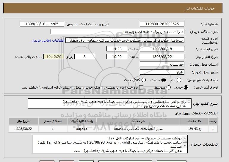 شرح کلی نیاز: رفع نواقص ساختمانی و تاسیساتی مرکز دیسپاچینگ ناحیه جنوب شرق (ماهشهر)