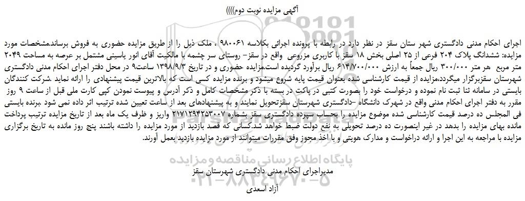اجرای احکام مدنی دادگستری شهر ستان سقز در نظر دارد در رابطه با پرونده اجرائی بکلاسه 980061 ، ملک ذیل را از طریق مزایده حضوری به فروش برساند.مشخصات مورد مزایده: ششدانگ پلاک 204 فرعی از 25 اصلی بخش 18 سقز با کاربری مزروعی  واقع در سقز- روستای سر چشمه با مالکیت آقای انور یاسینی مشتمل بر عرصه به مساحت 2049 متر مربع  هر متر 300/000 ریال جمعاً به ارزش 614/700/000 ریال برآورد گردیده است.مزایده حضوری و در تاریخ 1398/9/3 ساعت9 در محل دفتر اجرای احکام مدنی دادگستری شهرستان سقزبرگزار میگردد،مزایده از قیمت کارشناسی شده بعنوان قیمت پایه شروع میشود و برنده مزایده کسی است که بالاترین قیمت پیشنهادی را ارائه نماید .شرکت کنندگان بایستی در سامانه ثنا ثبت نام نموده و درخواست خود را بصورت کتبی در پاکت در بسته با ذکر مشخصات کامل و ذکر آدرس و پیوست نمودن کپی کارت ملی قبل از ساعت 9 روز  مقرر به دفتر اجرای احکام مدنی واقع در شهرک دانشگاه -دادگستری شهرستان سقزتحویل نمایند و به پیشنهادهای بعد از ساعت تعیین شده ترتیب اثر داده نمی شود .برنده بایستی فی المجلس ده درصد قیمت کارشناسی شده موضوع مزایده را بحساب سپرده دادگستری سقز بشماره 2171294253007 واریز و ظرف یک ماه بعد از تاریخ مزایده ترتیب پرداخت مانده بهای مزایده را بدهد در غیر اینصورت ده درصد تحویلی به نفع دولت ضبط خواهد شد.کسانی که قصد بازدید از مورد مزایده را داشته باشند پنج روز مانده به تاریخ برگزاری مزایده با مراجعه به این اجرا و ارائه دراخواست و مدارک هویتی و با اخذ مجوز وفق مقررات میتوانند از مورد مزایده بازدید بعمل آورند.