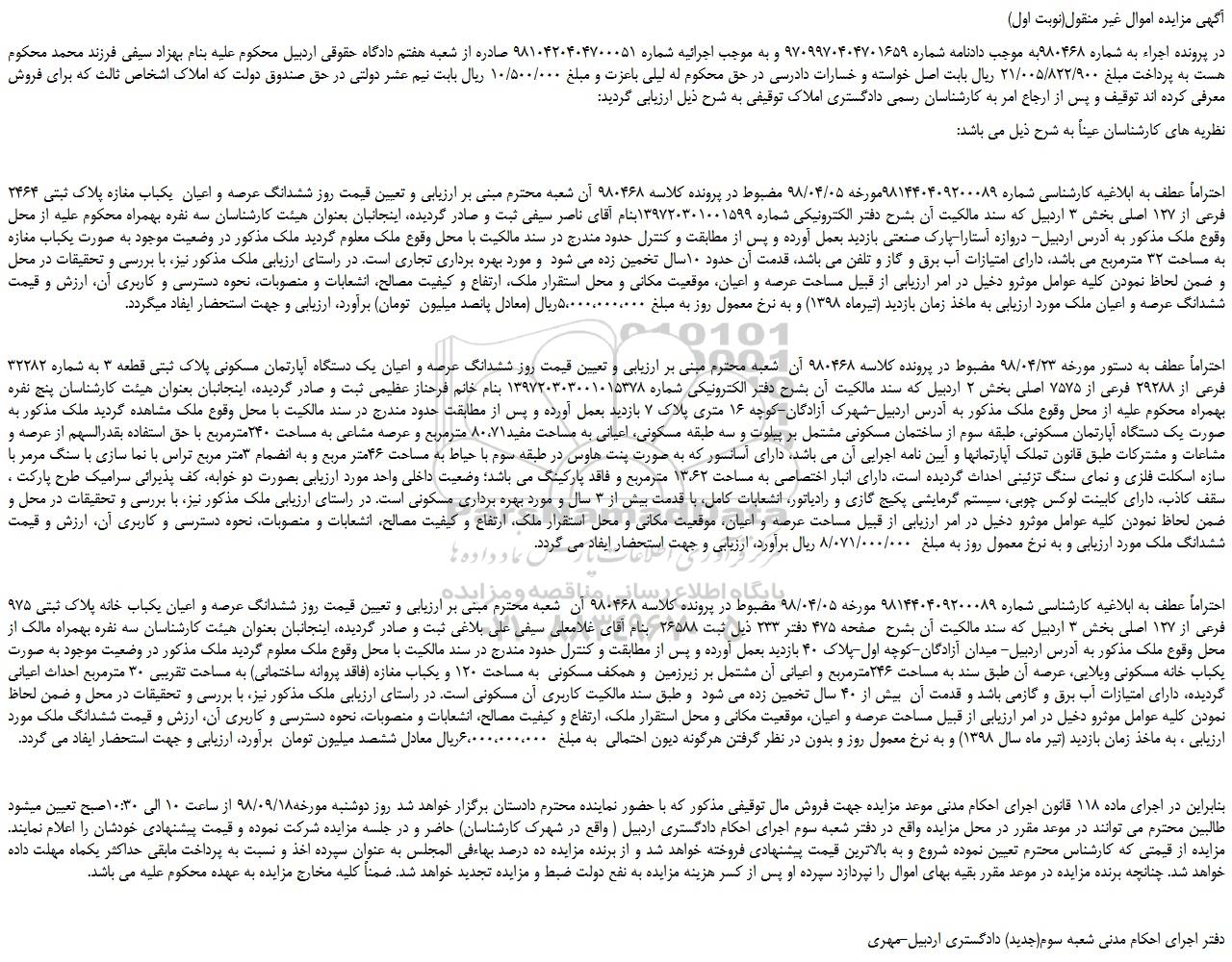 در پرونده اجراء به شماره 980468به موجب دادنامه شماره 9709970404701659 و به موجب اجرائیه شماره 9810420404700051 صادره از شعبه هفتم دادگاه حقوقی اردبیل محکوم علیه بنام بهزاد سیفی فرزند محمد محکوم هست به پرداخت مبلغ 21/005/822/900 ریال بابت اصل خواسته و خسارات دادرسی در حق محکوم له لیلی باعزت و مبلغ 10/500/000 ریال بابت نیم عشر دولتی در حق صندوق دولت که املاک اشخاص ثالث که برای فروش معرفی کرده اند توقیف و پس از ارجاع امر به کارشناسان رسمی دادگستری املاک توقیفی به شرح ذیل ارزیابی گردید: