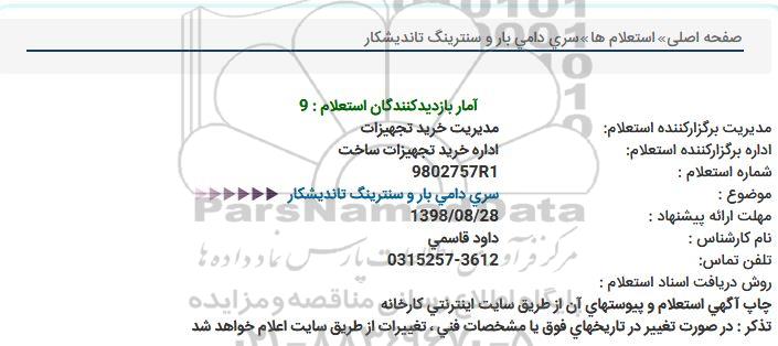 استعلام بها و موضوع استعلام استعلام سری دامی بار و سنترینگ تاندیشکار به اطلاع کلیه شرکتها و افراد متخصص واجد شرایط میرساند، آگهی گذار در نظر دارد از طریق استعلام بها، نسبت به انتخاب و دریافت پیشنهادات اقدام نماید. این استعلام با کد آگهی ثبت شده در سامانه خبرگزاری پارس نماد : 2003067 منتشر شده است. مشخصات استعلام : تاریخ شروع استعلام: 1398/08/20 آخرین مهلت ارسال پیشنهاد قیمت : 1398/08/28 و محل اجرای پروژه : استان اصفهان میباشد. استعلام قیمت مورد درخواست : استعلام سری دامی بار و سنترینگ تاندیشکار با دستهبندیهای تخصصی و گروه های مرتبط : ساخت،نصب و تعمیرات صنایع فولاد, تجهیزات و ماشین آلات صنعتی, استعلام اطلاع رسانی میگردد.